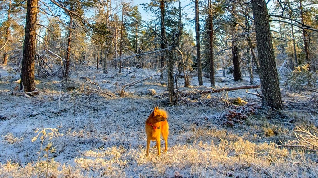 Joikun haukku alkaa hetki ennen auringonnousua! Se ilmeisesti sai kevyestä pakkastuulen vireestä vainun jo autolle, tai ainakin siltä vaikuttaa, kun gepsin jälkiloki näyttää lähes suoraa viivaa 350 metrin päähän. Itse olen ehtinyt nousta rinnettä vasta viitisenkymmentä metriä kohdasta, jossa Rauli jätti minut tienposkeen sillä ajatuksella, että tämän päivän aikana otamme selvää tästä vanhojen metsien suojelualueesta.